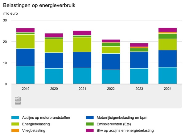 Van alle belastingen op het energieverbruik had 60 procent in 2024 te maken met wegvervoer: accijns op motorbrandstoffen, belasting op de aanschaf van een auto of motor (bpm) en motorrijtuigenbelasting. Wanneer de btw geheven op accijnzen wordt meegeteld dan is dit aandeel zelfs 63 procent. 20 procent kwam uit de energiebelasting op elektriciteit in aardgas.